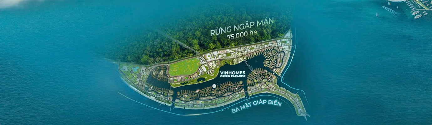 Phía Tây và Bắc của dự án được bao bọc bởi Khu dự trữ sinh quyển Cần Giờ rộng hơn 40.000ha rừng ngập mặn, được UNESCO công nhận là di sản thiên nhiên thế giới. Phía Đông hướng ra biển lớn, đón gió mát quanh năm và nguồn năng lượng tự nhiên dồi dào. Tổ hợp đô thị được quy hoạch trên nền địa thế “rừng tựa lưng – biển trước mặt”, tạo nên thế phong thủy vững bền và khẳng định vị thế độc tôn của Vinhomes Green Paradise giữa lòng đô thị biển tương lai.