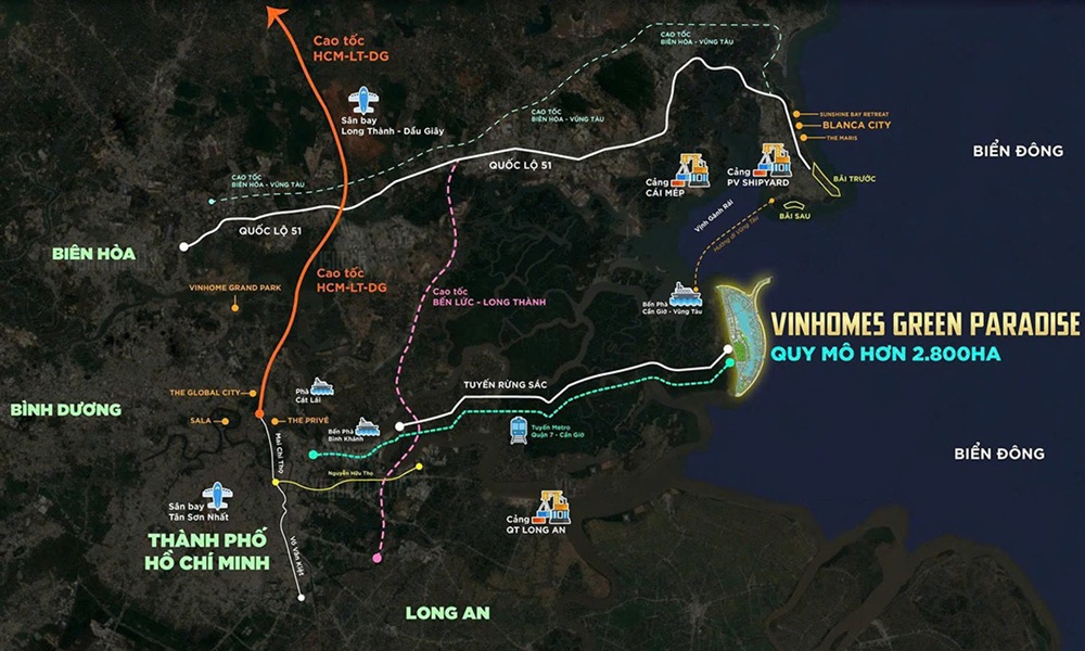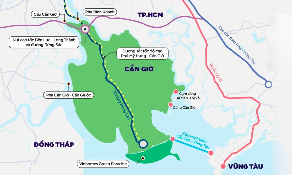 Trong toàn bộ khu vực Cần Giờ, Long Hòa và Cần Thạnh là hai địa bàn được quy hoạch phát triển đô thị du lịch ven biển. Vinhomes Green Paradise nằm ngay tại trung tâm khu vực này với quỹ đất lớn gần 2.870 ha, đủ điều kiện để hình thành một đại đô thị ven biển quy mô lớn, tích hợp không gian ở, du lịch, thương mại và dịch vụ.